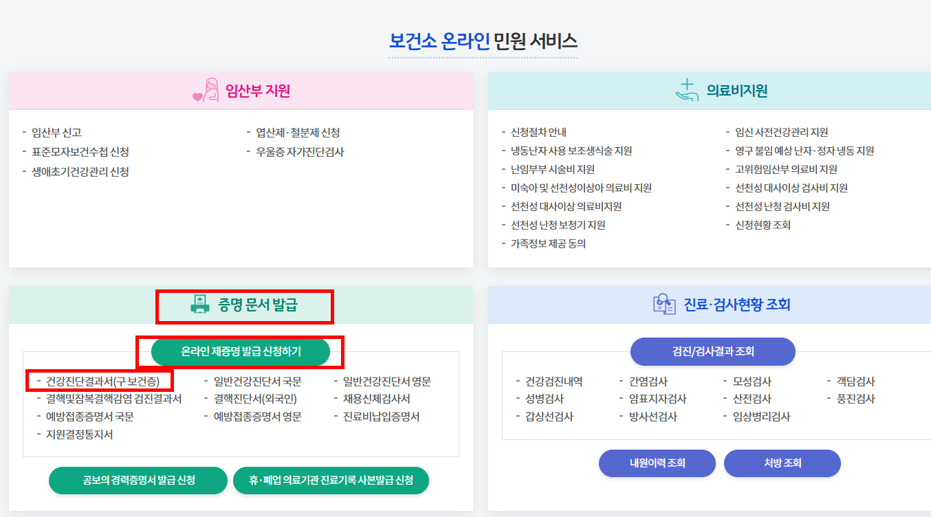 공공보건포털 e보건소에 접속 → '민원서비스' → 건강진단결과서(구 보건소) 또는 홈페이지 하단에 보건소 온라인 민원 서비스 → 증명문서 발급 → '온라인 제증명 발급 신청' → 건강진단결과서(구 보건소)를 클릭한 후, 본인 인증 후에 증명서 발급조회를 진행하고 인쇄를 누르면 인터넷 발급이 완료됩니다.