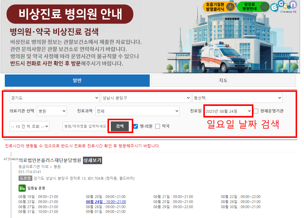 일요일 진료 병원은 찾기 쉽지 않지만, 보건복지부가 운영하는 ‘응급의료포털(e-gen)’ → 비상진료 병의원 안내나 응급의료정보제공 앱을 이용하면 실시간으로 확인 가능합니다.